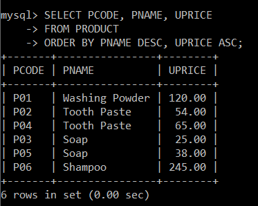 c) List the Product Code, Product name and price in descending order of their product name. If PName is the same then display the data in ascending order of price.