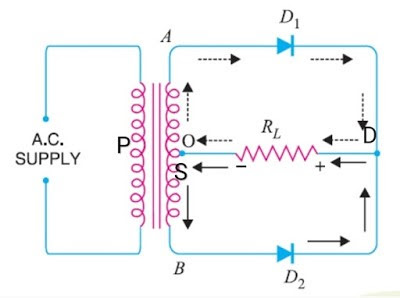 During the first half cycle of the input voltage, the terminal A is positive with respect to O while B is negative with respect to O. Diode first is forward bias and conducts while diode second is reverse bias and does not conduct, the current flow through RL from D To O. During the second half cycle, A is negative and B is positive with respect to O, thus diode first is reverse bias and diode second is forward biased. The current through RL is in the same direction as during the first half cycle. The resulting output current is a continuous series.
