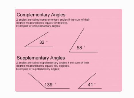 The two angles which add up to 90 degrees is said to be complementing each other. Similarly, two angles which add up to 180 degrees are said to be supplementary angles.
